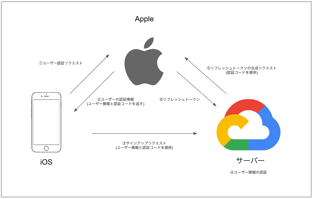 全体としては、iOSアプリ側で認証を行い、サーバーでユーザー情報を検証・作成・提供するという流れです。